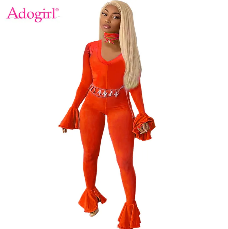 Special Offer Adogirl Women Sexy solidny kombinezon Flare głęboki dekolt długi rękaw dzwonkowy Casual Romper Foot But Pants 2019 jesienne modne kombinezony Discount 47% Today!