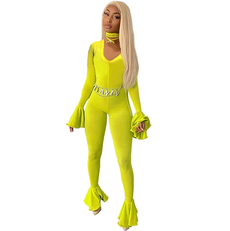 Product Name: Adogirl Women Sexy solidny kombinezon Flare głęboki dekolt długi rękaw dzwonkowy Casual Romper Foot But Pants 2019 jesienne modne kombinezony