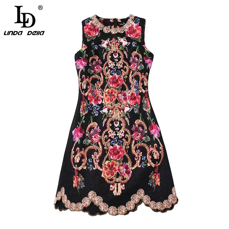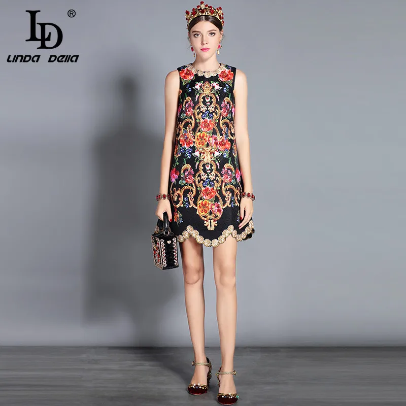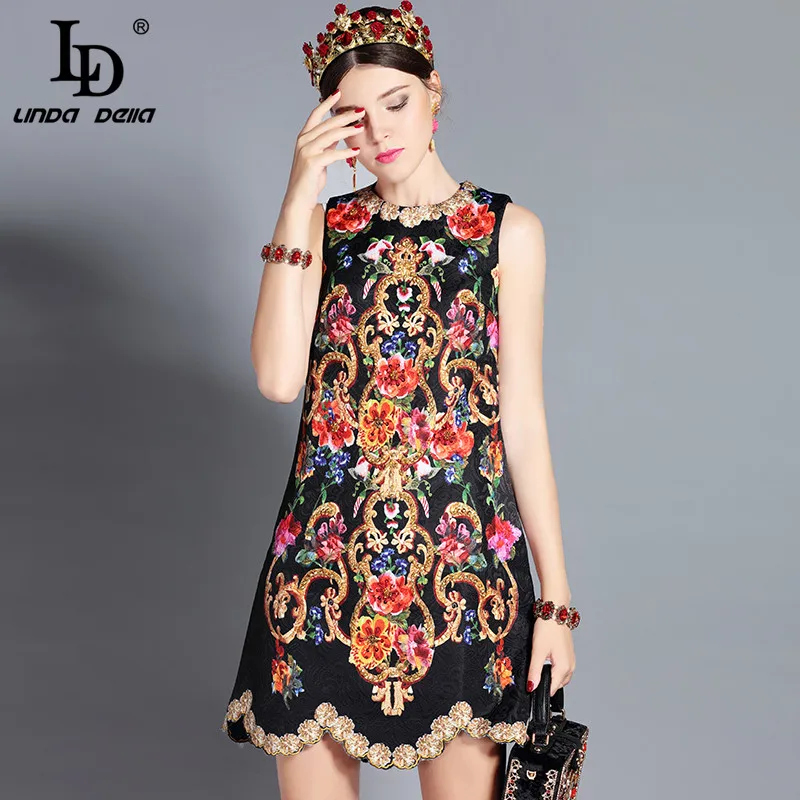 . (Zniżka 39%) Tanie LD LINDA DELLA 2019 jesień wybieg mody sukienka damska bez rękawów Tank Retro kryształ frezowanie Floral Print Mini sukienka vintage Ceny.