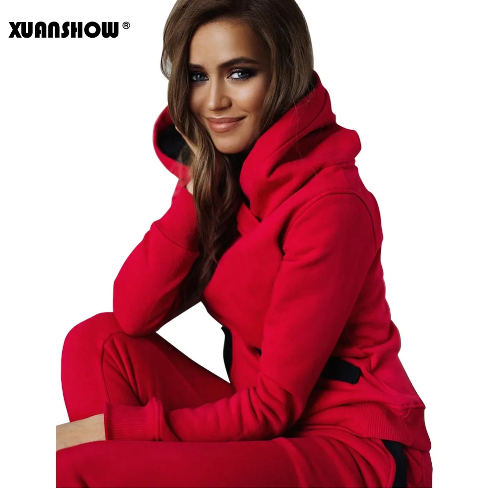 Product Name: XUANSHOW 2019 moda jesień zima kobiety dresy stroje Big Hat bluzy + Slim pełne spodnie 2 sztuka zestaw kieszenie zestaw damski