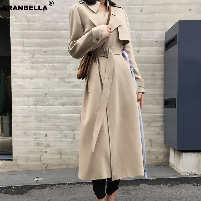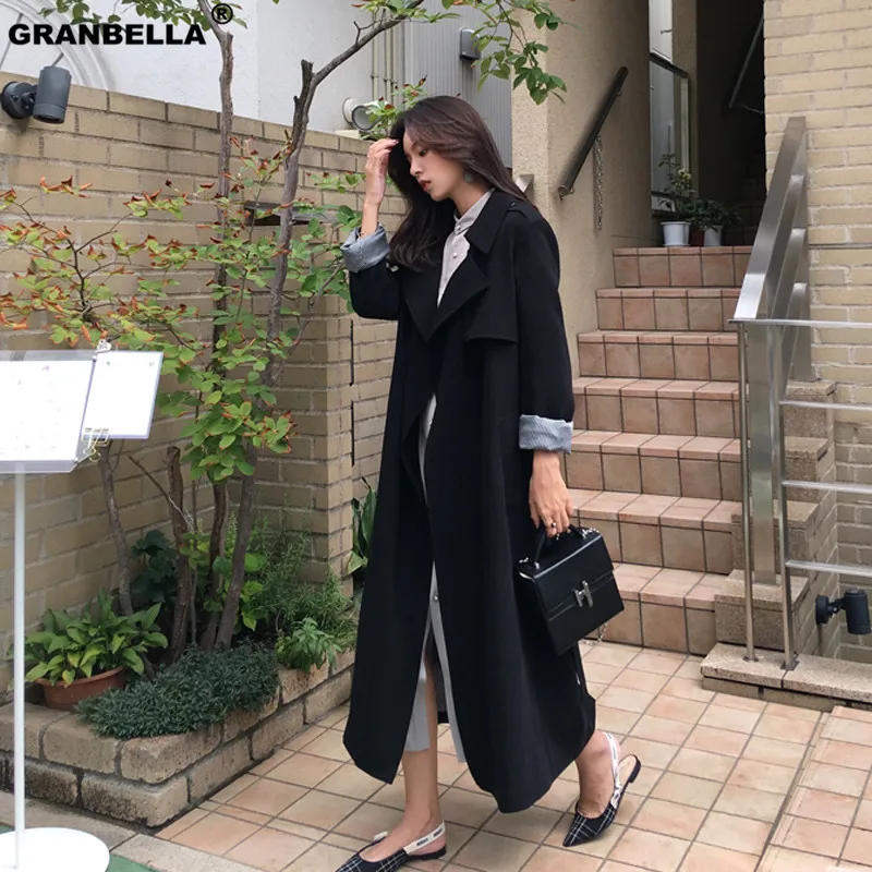 . (Zniżka 26%) Skup Tanie Wiosna jesień Maxi długi damski luźny trench Coat z paskiem Khaki i czarne z połyskiem rozmiar koreański styl wiatrówka znosić Ceny.