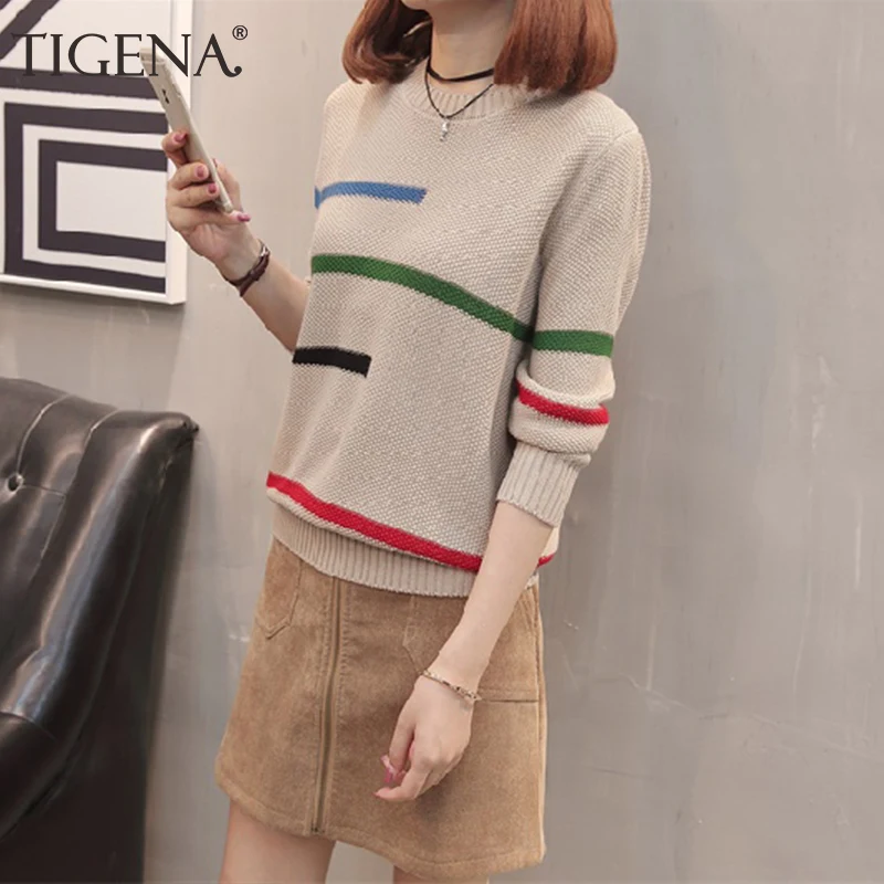 Special Offer TIGENA 2019 jesień zimowy swetr pullover kobiety sweter koreański piękny kolor paski sweter z dzianiny z długim rękawem kobiet Khaki Discount 40% Today!