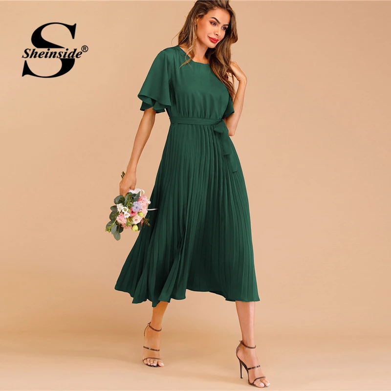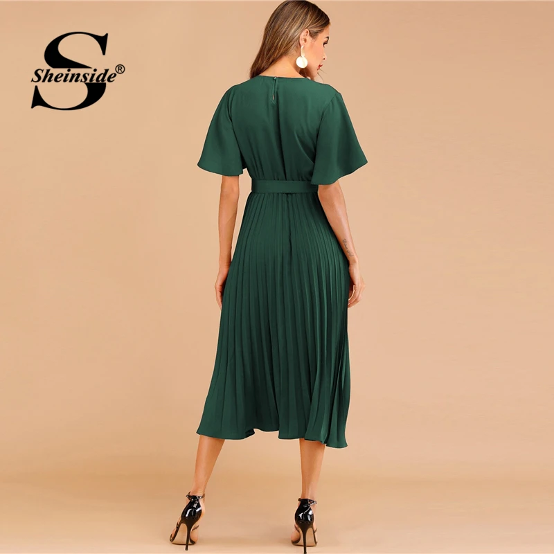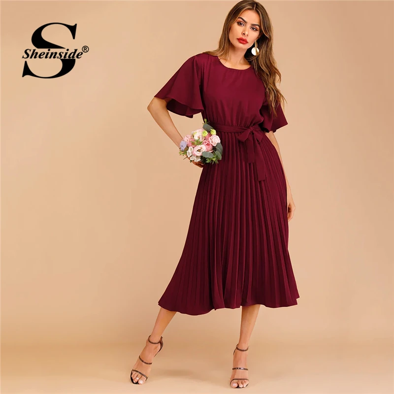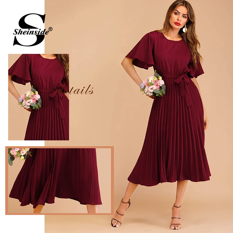 Special Offer Sheinside bordowy guzik dziurka plisowana sukienka z paskiem falbany rękaw kobiet 2019 wiosenne sukienki elegancka solidna sukienka damska Discount 46% Today!