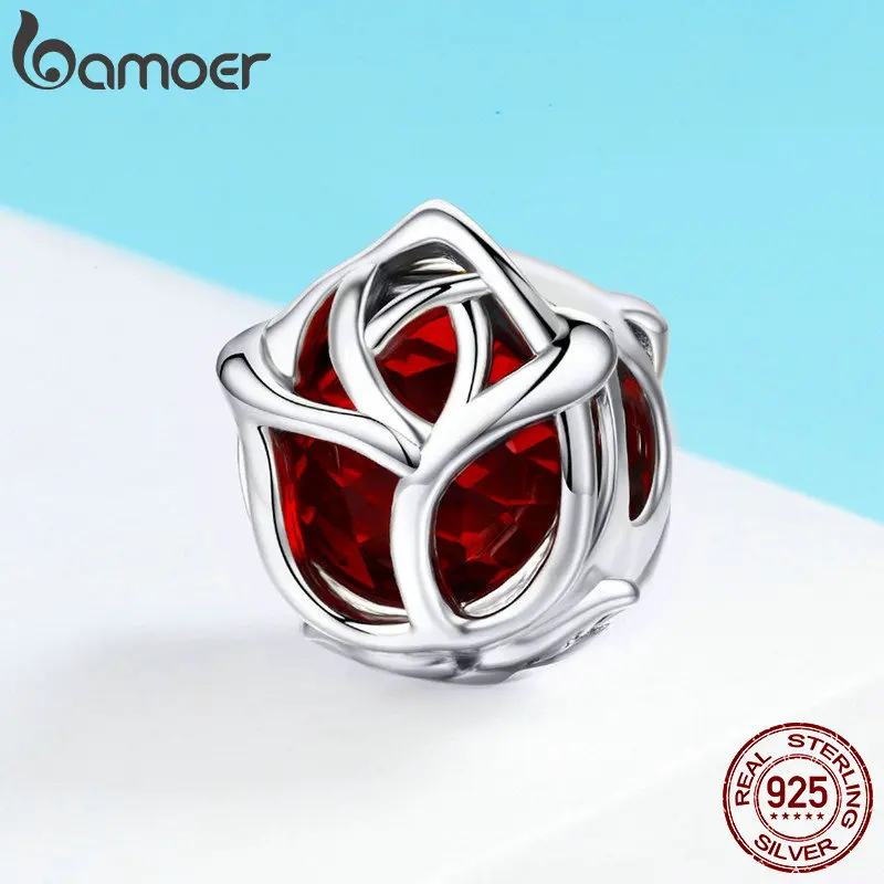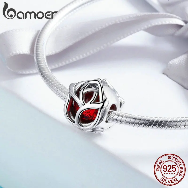 Product Name: BAMOER romantyczny 100% 925 Sterling srebrna róża kwiat, czerwone kryształowe koraliki charms fit kobiety Charm bransoletka DIY tworzenia biżuterii SCC568