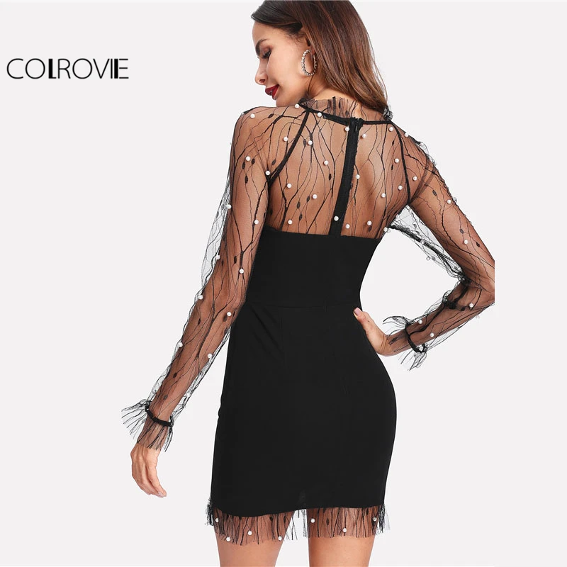 Special Offer COLROVIE czarna perła frezowanie winorośli panel z siatki sukienka kobiety wzburzyć wokół szyi z długim rękawem Sexy Dress Party obcisła sukienka Discount 50% Today!