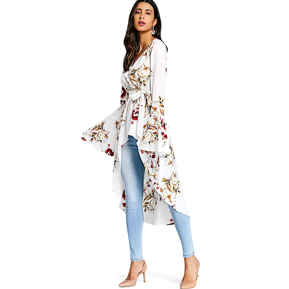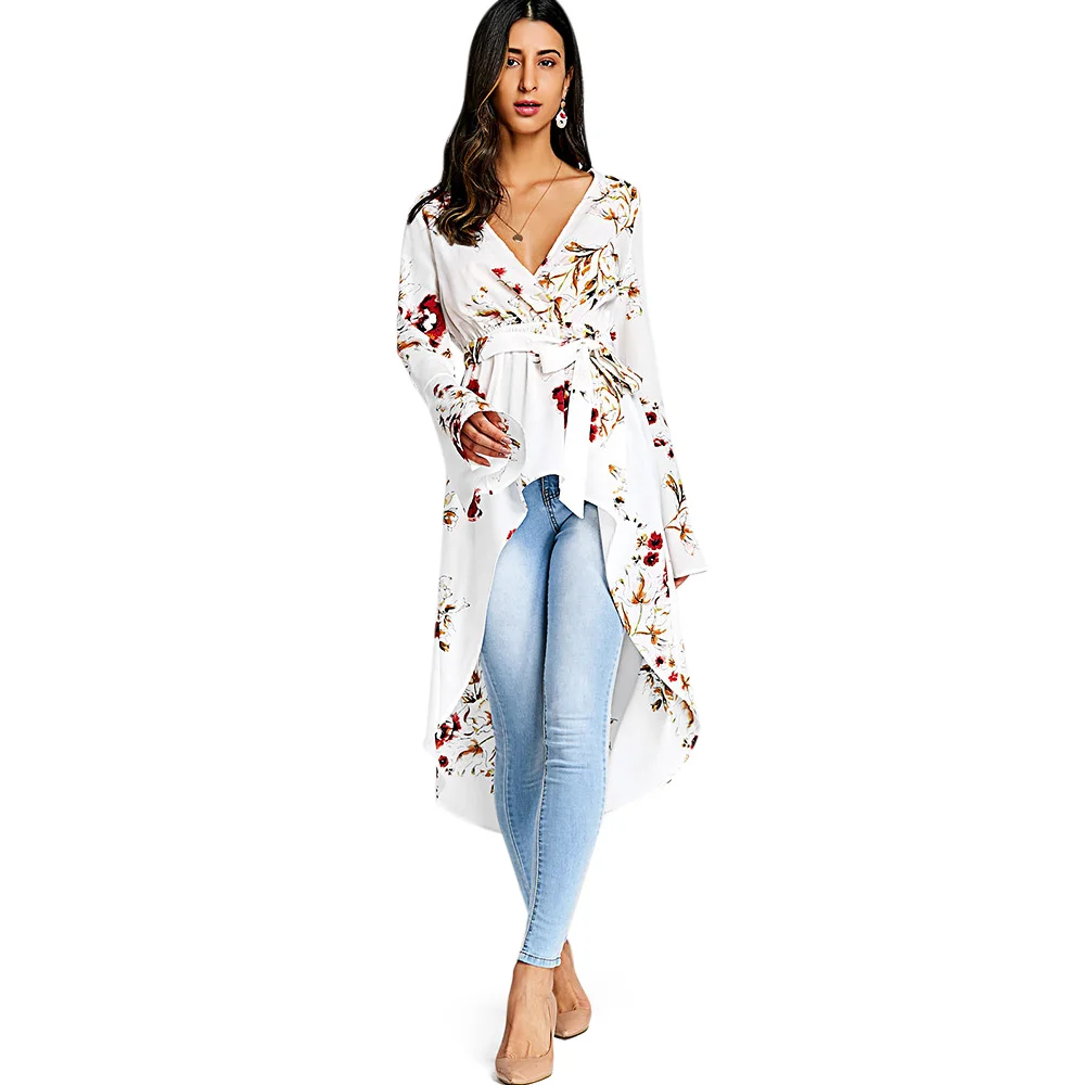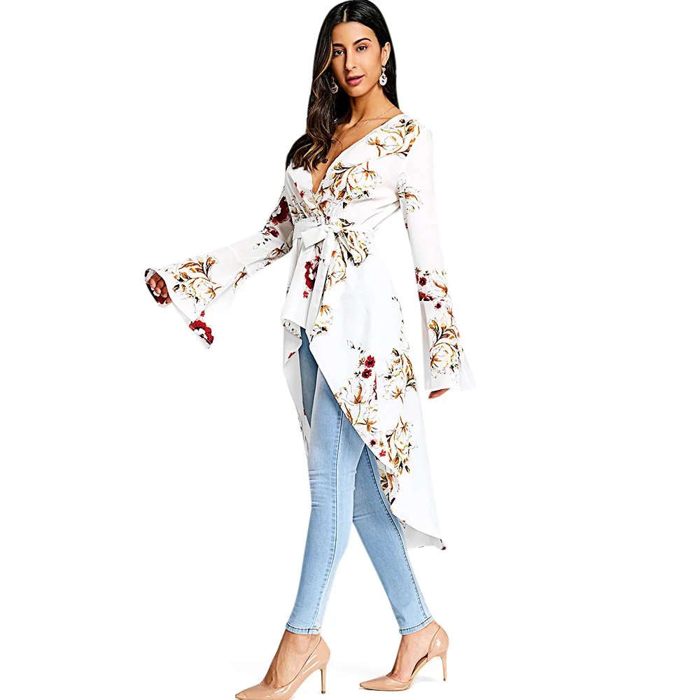 Special Offer VESTLINDA kobiety dzwonkowy rękaw z kwiatowym wzorem długa niska Fishtail bluzka moda Casual tłoczenie szyi długie rękawy długie bluzki Blusas Discount 40% Today!