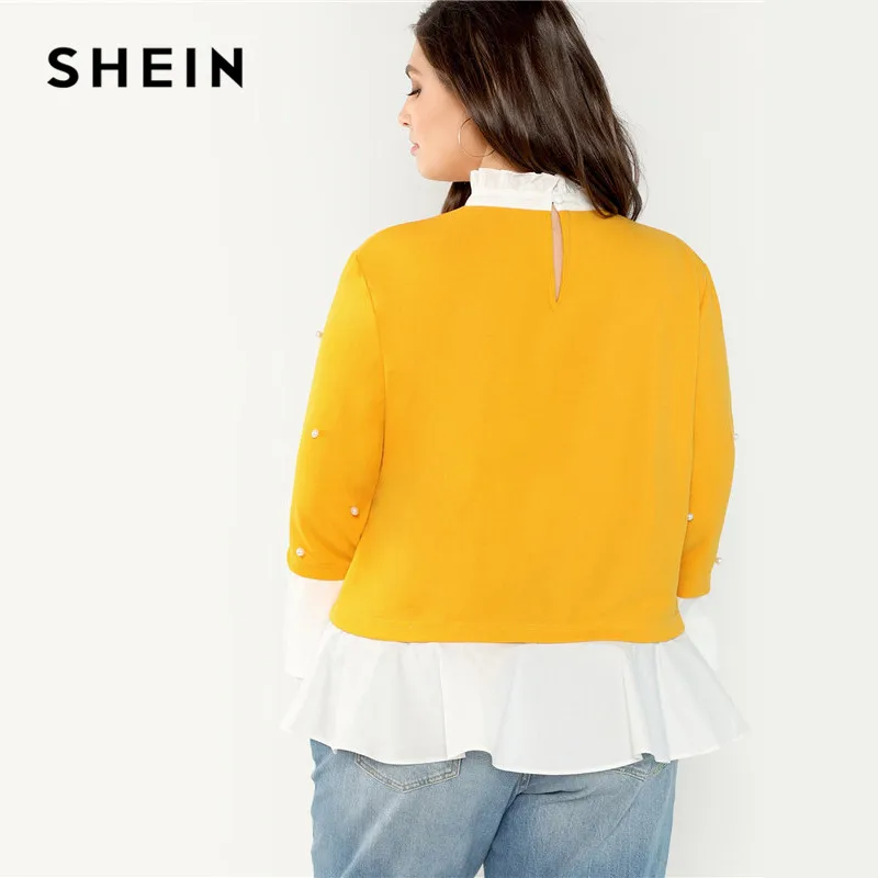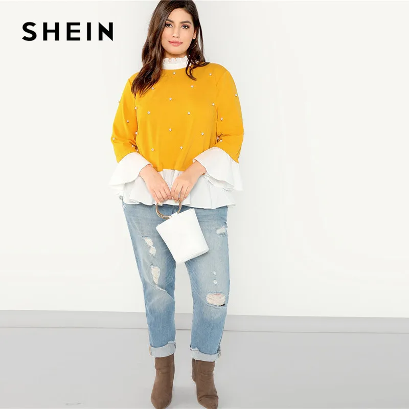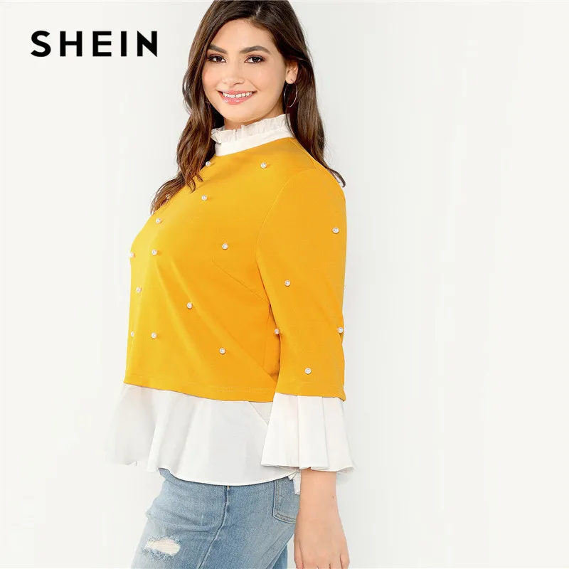 . (Zniżka 41%) Skup Tanie SHEIN Pearl zroszony wzburzyć stanąć kołnierz rękaw motylek imbir Plus rozmiar damska bluzka 2018 Patchwork wzburzyć Hem jesienna bluzka Ceny.
