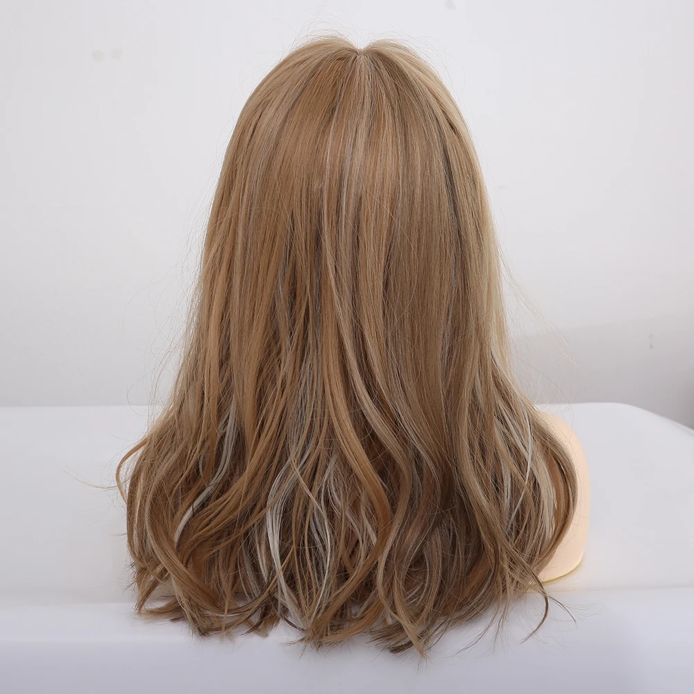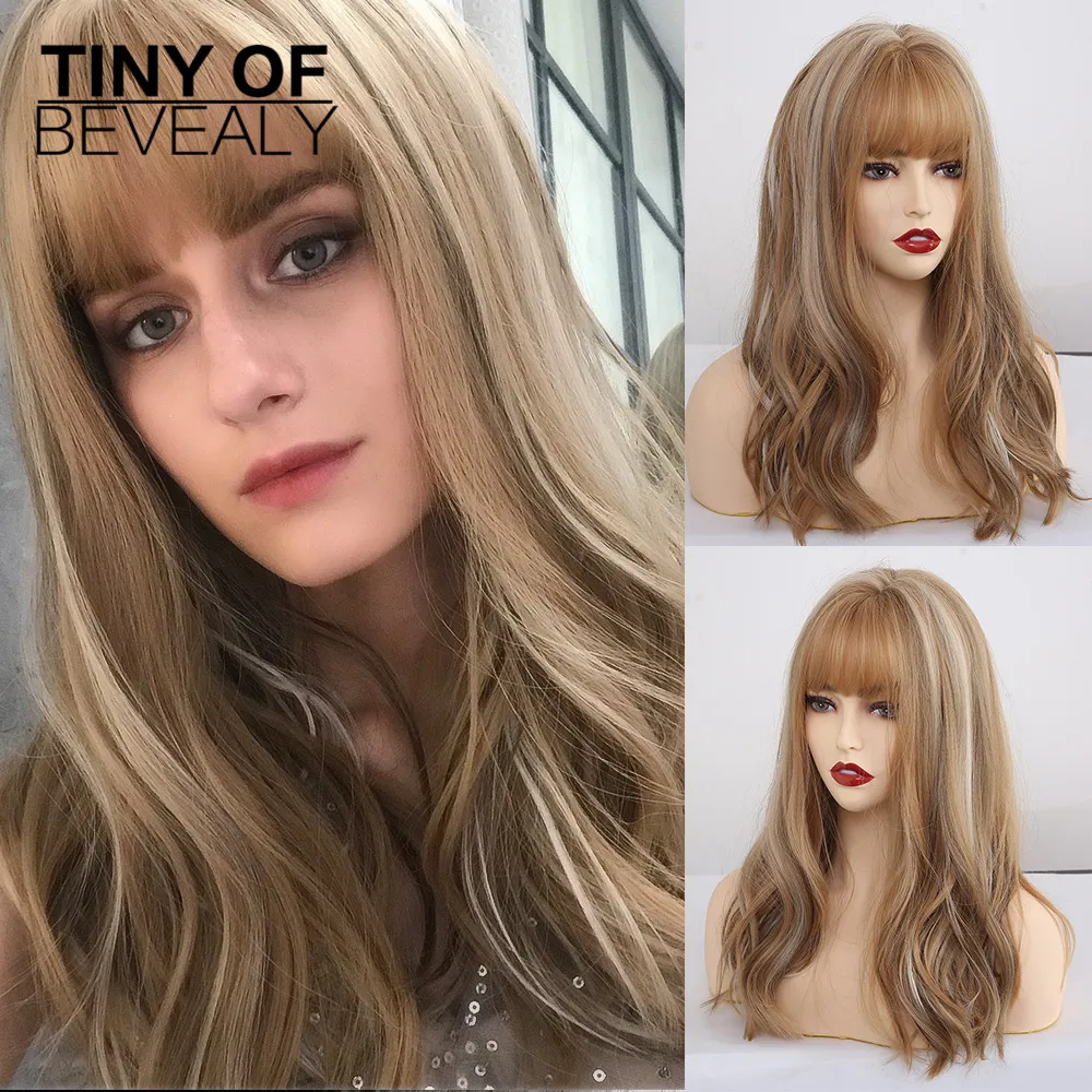 Product Name: Długie syntetyczne peruki z grzywką mieszane blond brązowe naturalne fale peruki dla białych kobiet Cosplay peruki włókno termoodporne peruki