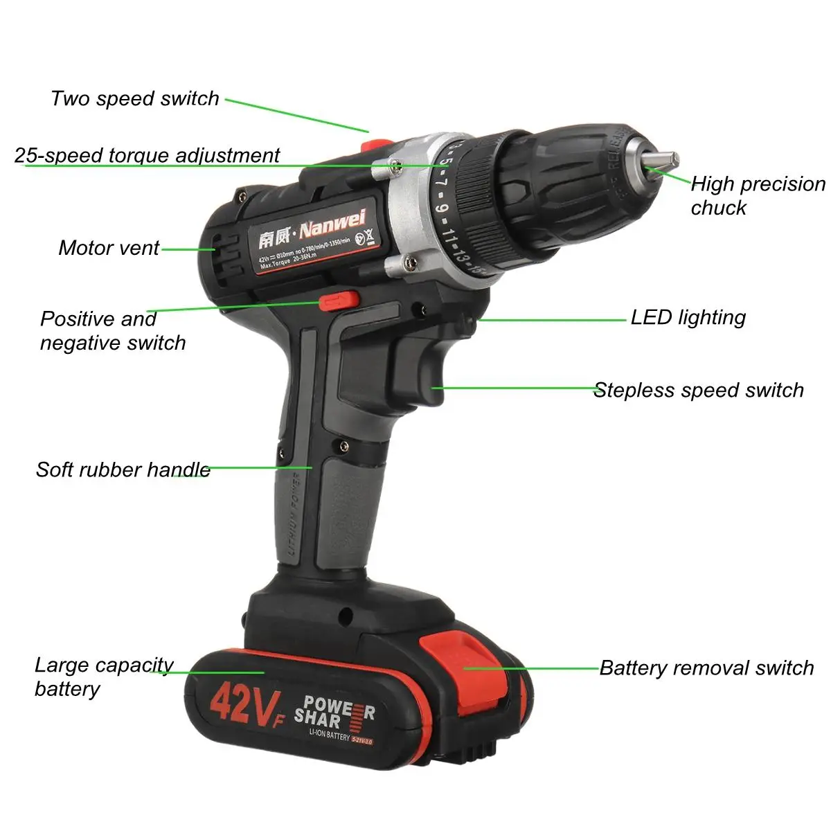 Product Name: 2 prędkości bezszczotkowy bezprzewodowy elektryczna wiertarka udarowa światła LED akumulator litowo jonowy 25 1 25 ~ 28Nm 42Vf 5000mAh
