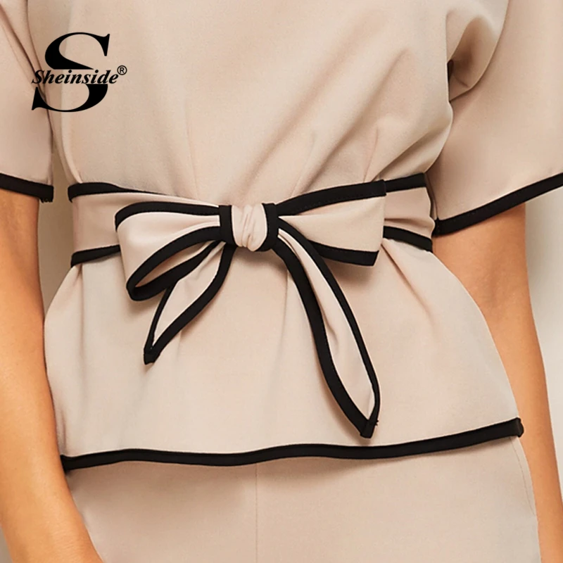 Special Offer Sheinside elegancki podział rękawem kontrast wiążące bluzki i spodnie zestaw kobiety 2019 lato Boat Neck popędzający bluzka 2 sztuka zestaw Discount 46% Today!