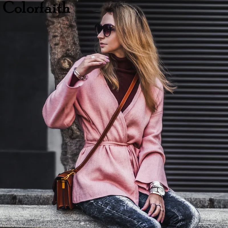 Special Offer Colorfaith kobiety sweter rozpinane 2019 Knitting jesień zima sznurowany pas luźna odzież wierzchnia eleganckie Casual bluzki damskie SW8842 Discount 50% Today!