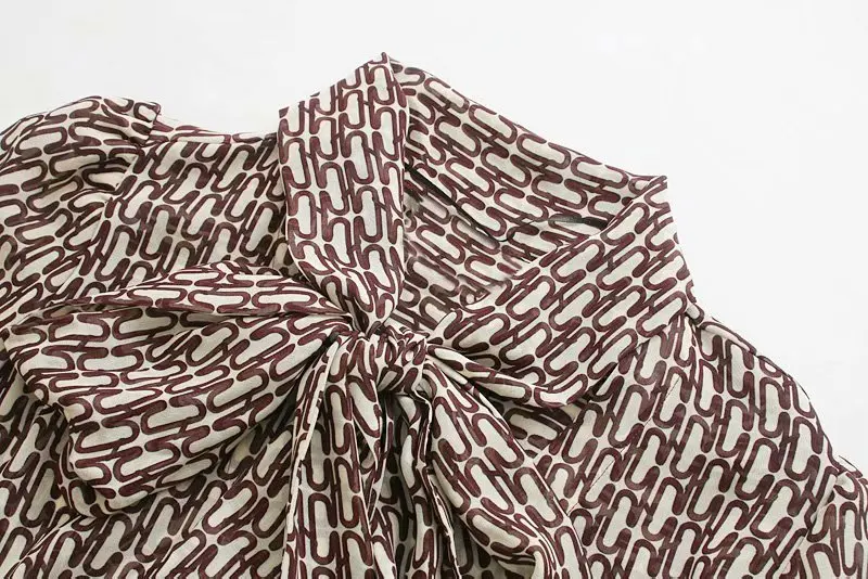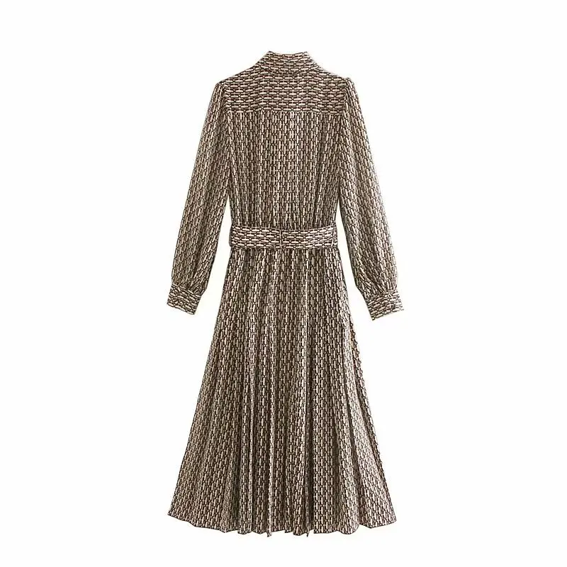 Product Name: 2019 kobiety w stylu vintage v neck geometryczne drukowanie hem sukienka plisowana midi kobiet z długim rękawem muszka vestidos elegancki pasek sukienki DS2981