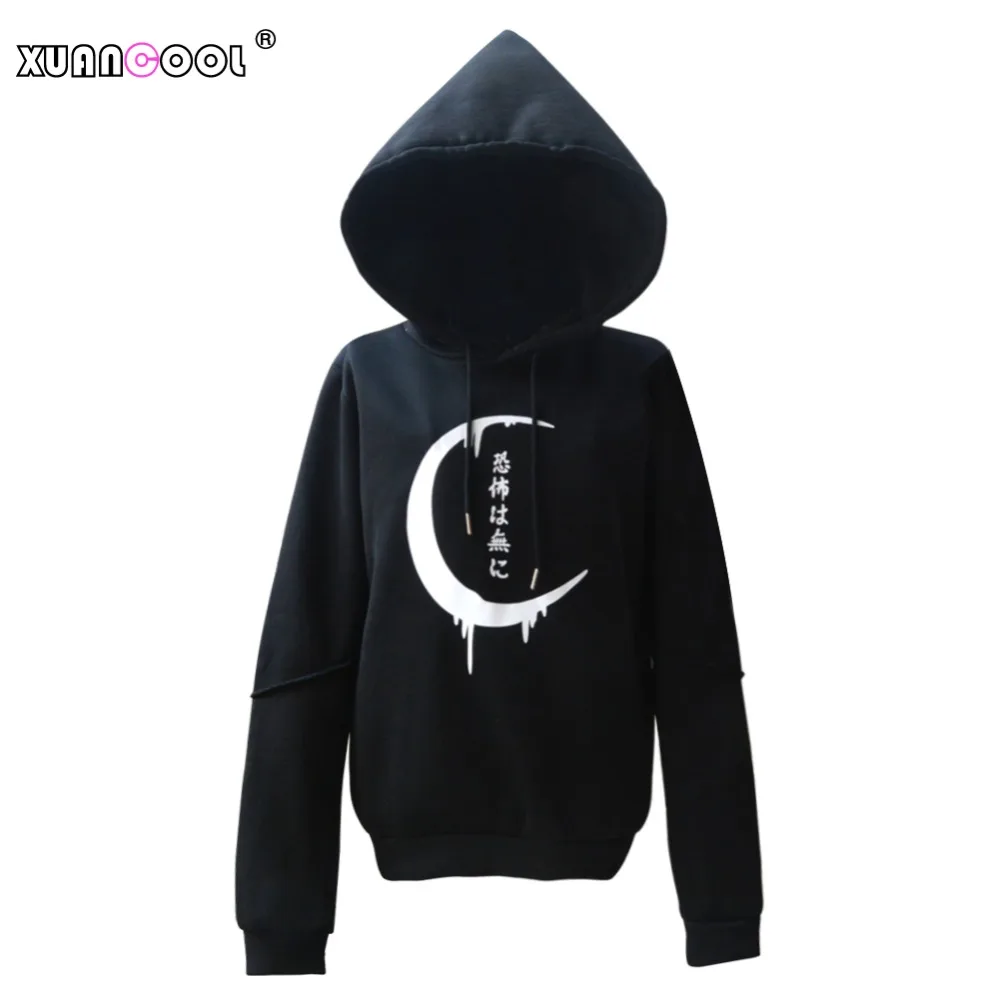 . (Zniżka 38%) Tanie XUANCOOL bluzy damskie Gothic Moon japońskie litery drukowane szwy rękaw sweter płaszcz damski Big Hat bluzy Moletom Cena.