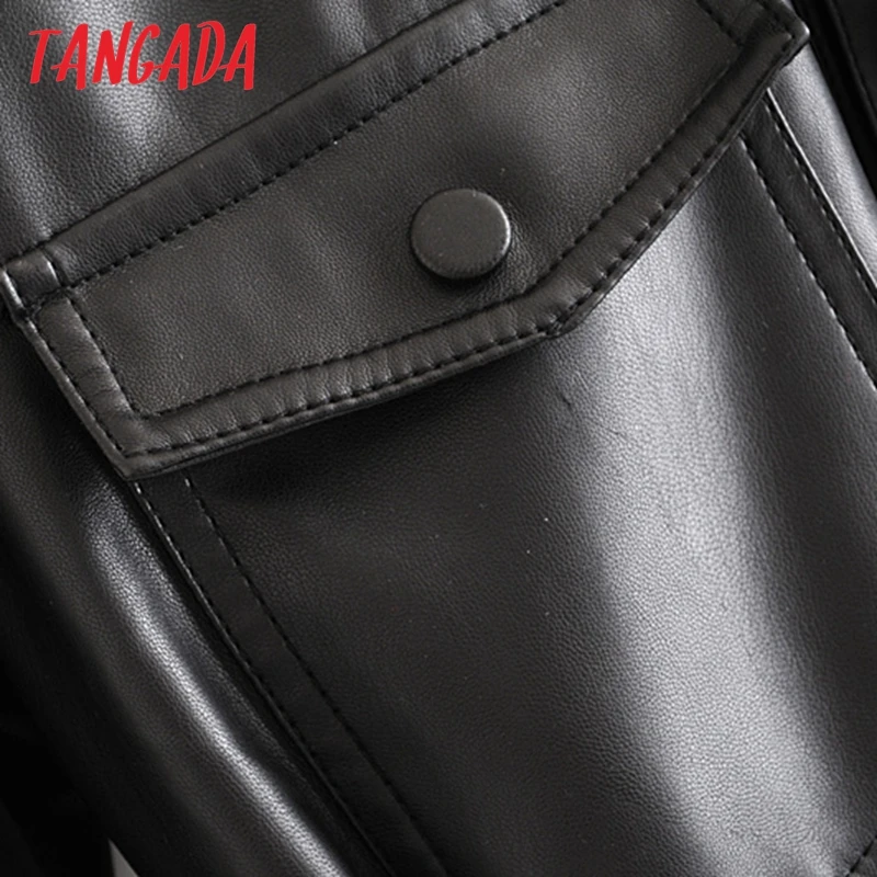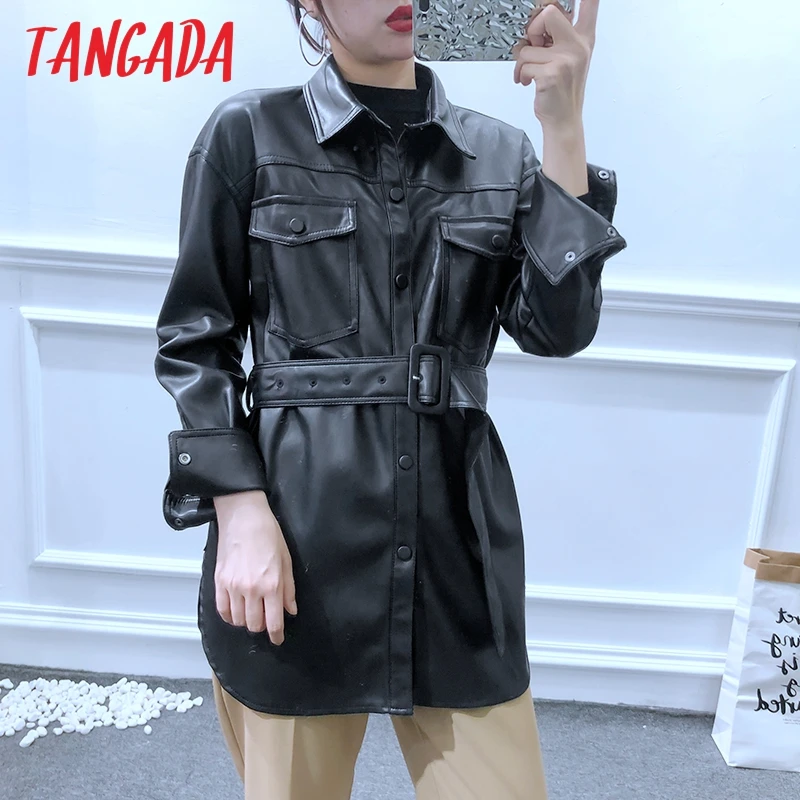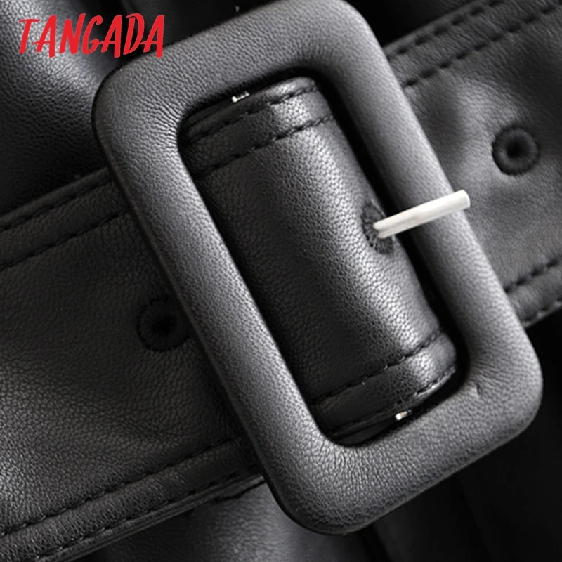 Special Offer Tangada kobiety faux skórzana kurtka płaszcz z paskiem skręcić w dół kołnierz panie z długim rękawem w stylu boyfriend szeroki czarny płaszcz 6A308 Discount 34% Today!